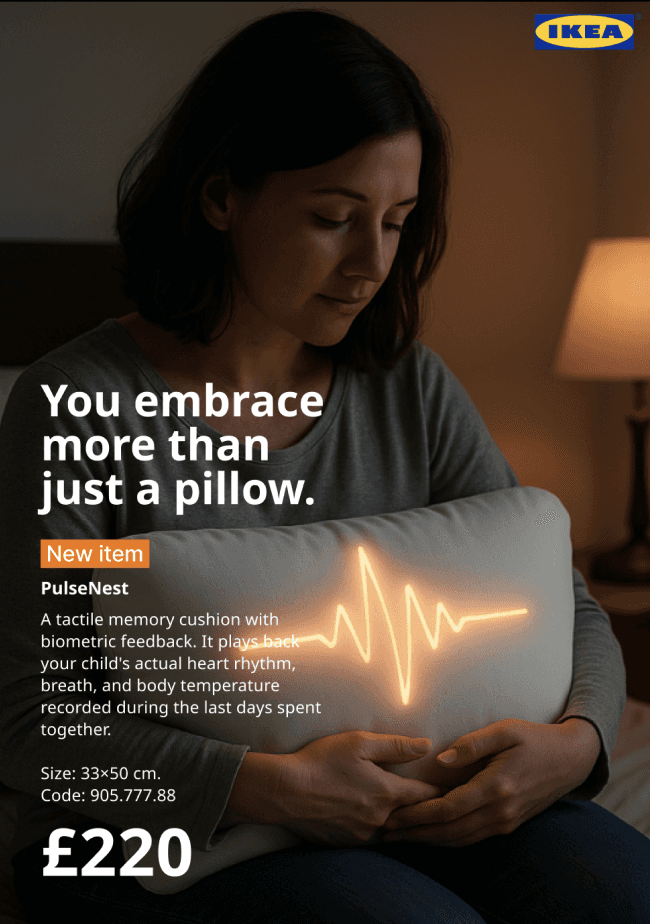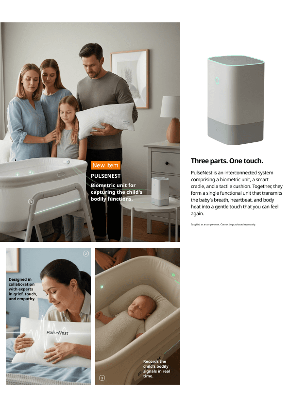 Fig. 1: PulseNest in the aesthetic of a global retail chain. The visual combines a homely atmosphere with a technological description of a product that "plays back the actual heart rhythm and breath of your child." The £990 price tag adds a terrifying reality – grief becomes an item in a shopping cart.
