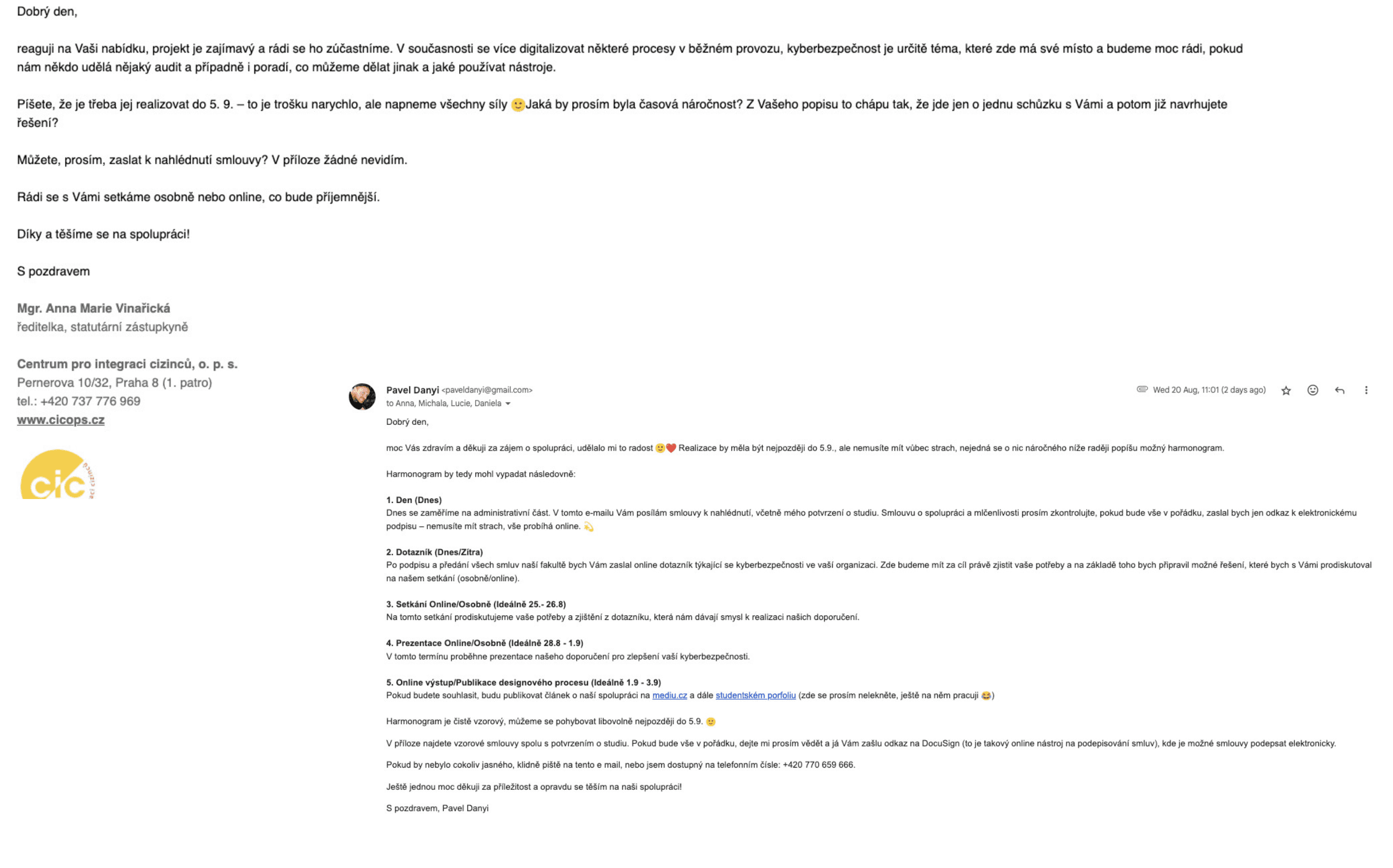 Official contact has been established with the organization Center for the Integration of Foreigners, o.p.s., and the framework for this academic project has been discussed. The collaboration was formalized through the conclusion of a contract that defines the terms and scope of engagement for both parties. CIC management consents to the student analyzing the organization's needs in the field of cybersecurity and proposing appropriate design measures. This contractual framework confirms CIC’s interest in strengthening its security and ensures that the project outputs will be practically applicable and beneficial to the organization and its clients.