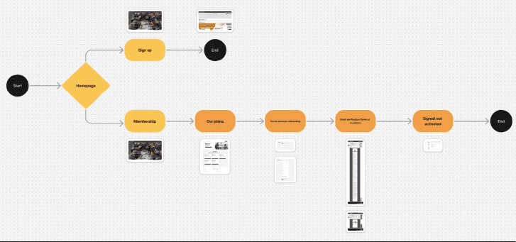 The second path is through membership, where a potential member can even register, and after selecting a membership, they will receive an email with the terms of service. Both paths are peculiar and inadequately address the situation. I mapped these paths by taking screenshots of each page and creating a specific flow to have a clear overview of how it works in reality.